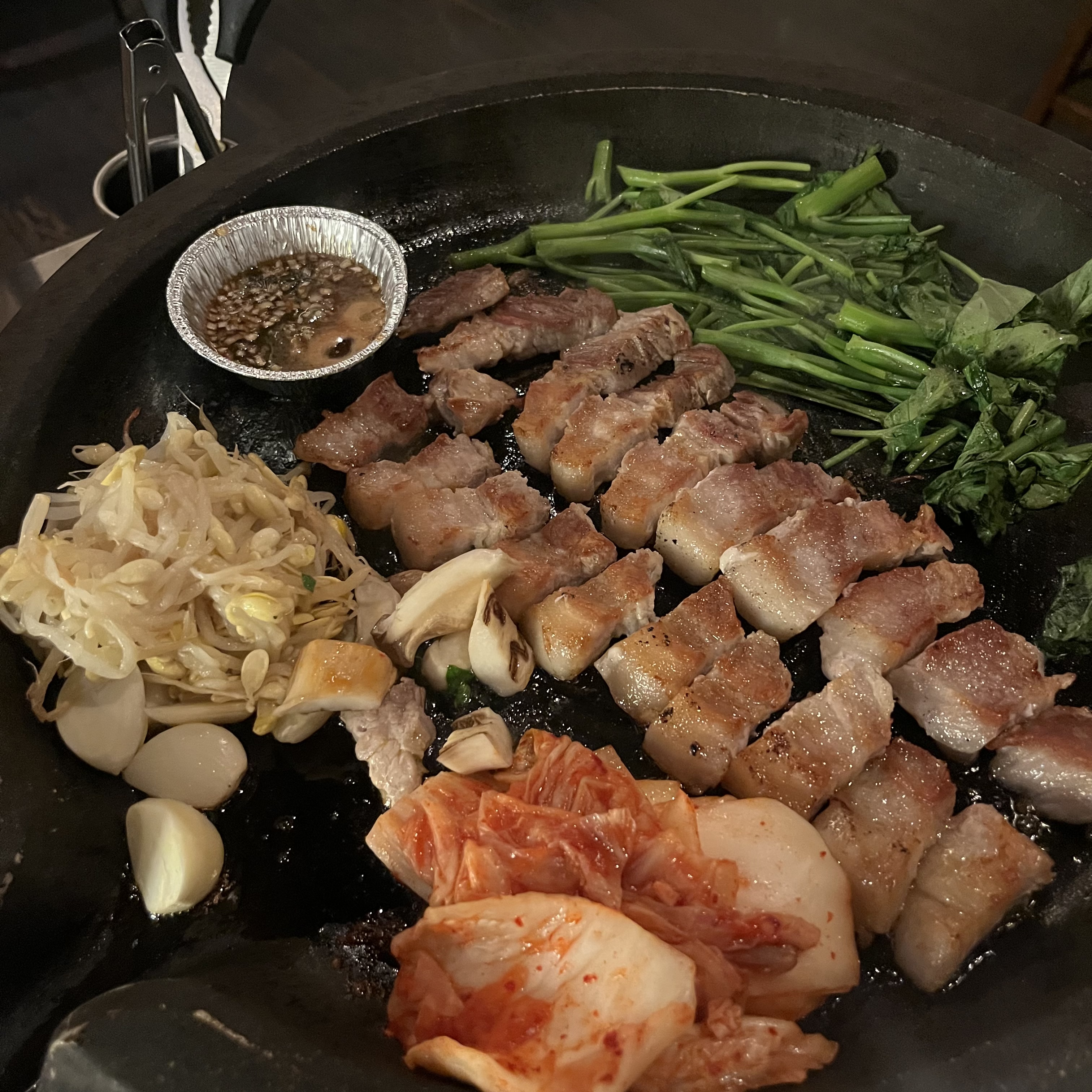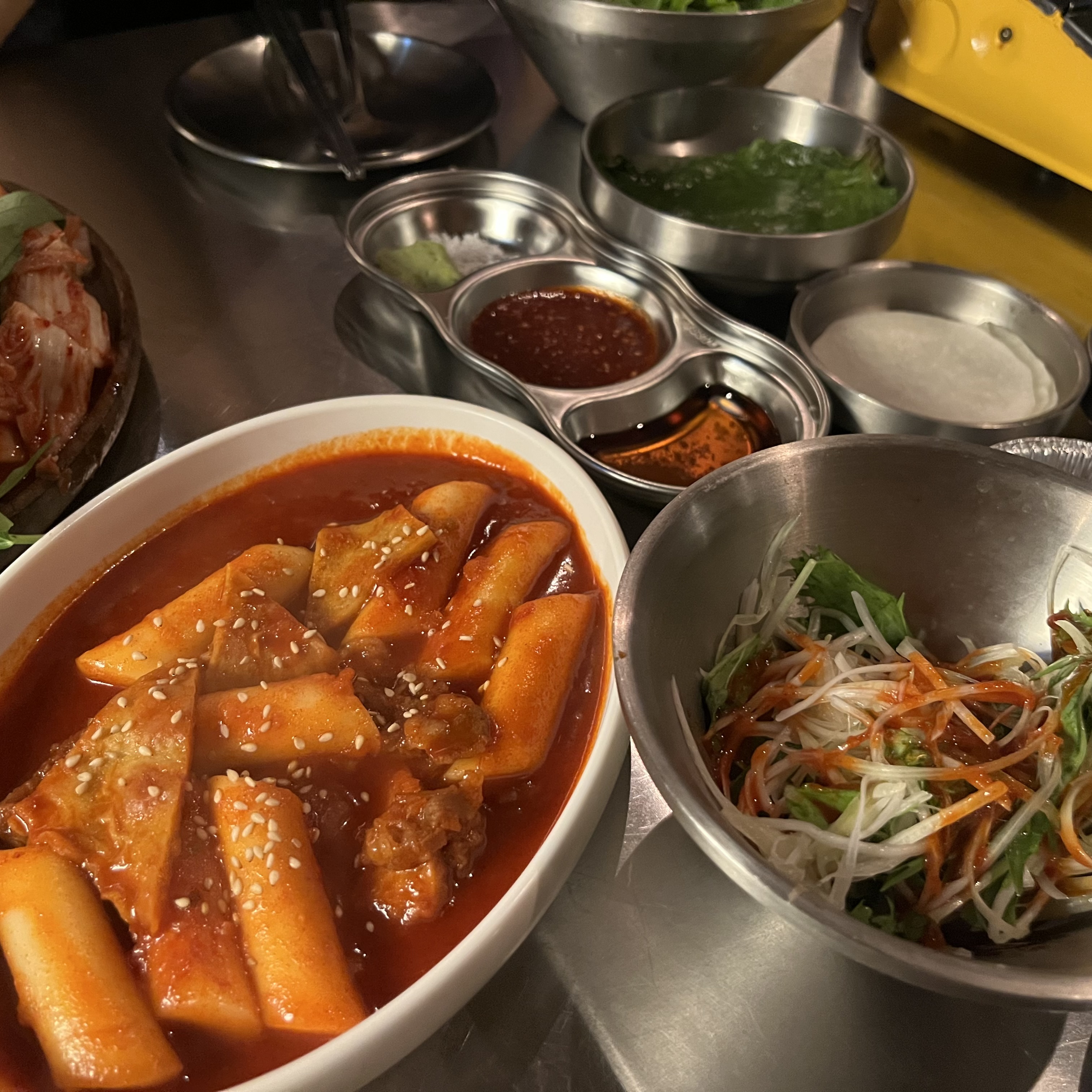 오랜만에 떡볶이랑 삼겹살을 먹으면서